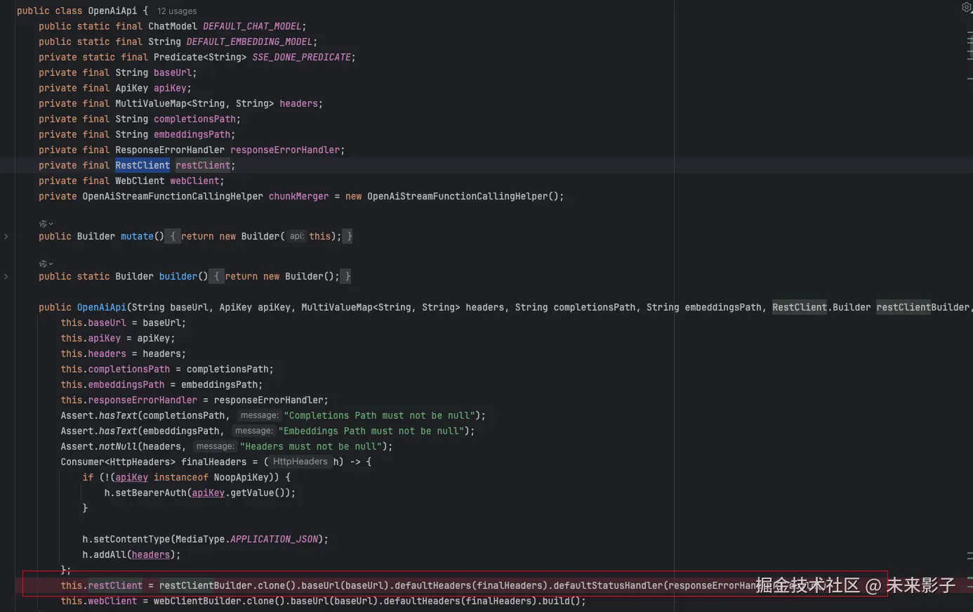 首先看到,AI 模型的调用方 RestClient 是由 RestClient.Builder restClientBuilder 传递