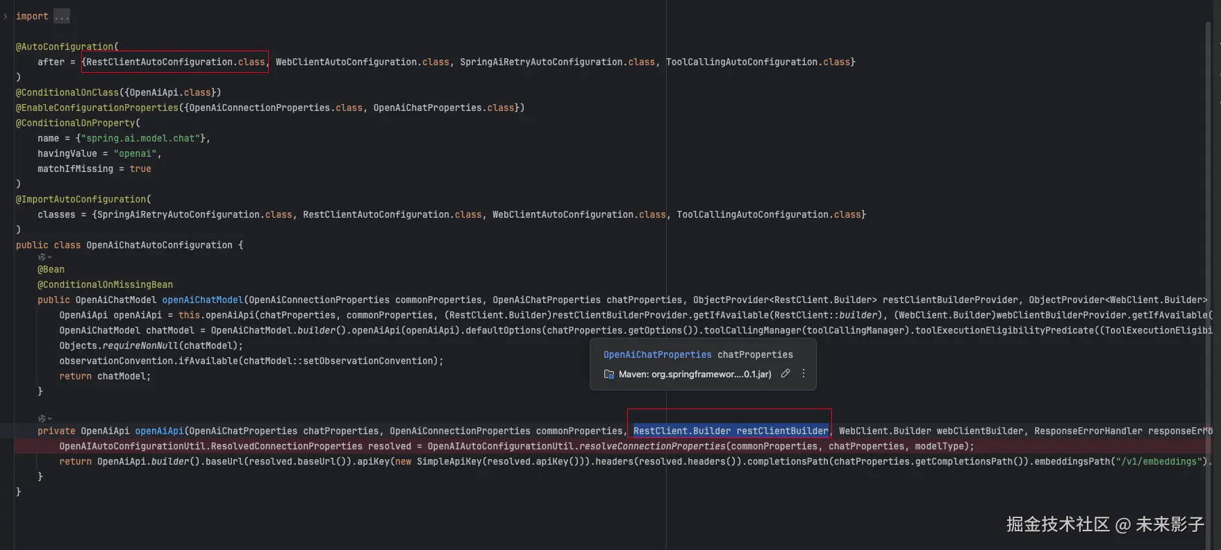 OpenAiChatAutoConfiguration 类实例化 OpenAiApi 类,并导入 RestClient.Builder restClientBuilder