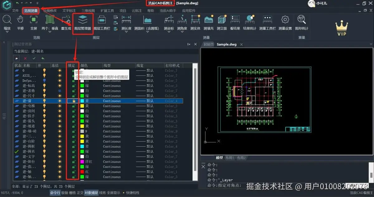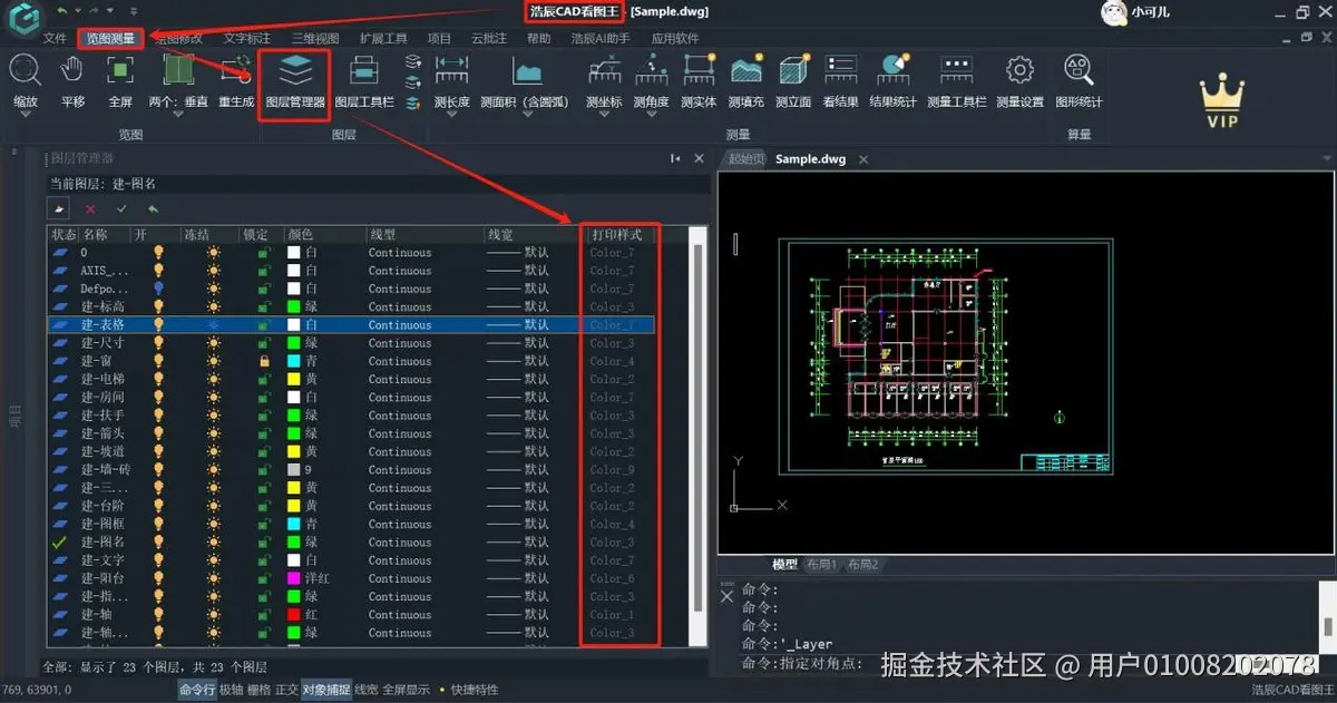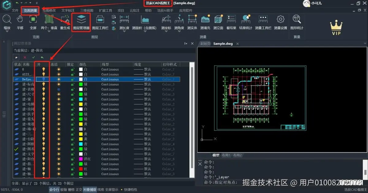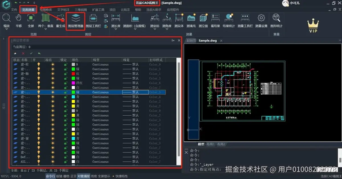 在浩辰CAD看图王的览图测量菜单栏中,点击“图层管理器”选项。随后,界面左侧将展示图层管理器的详细内容。