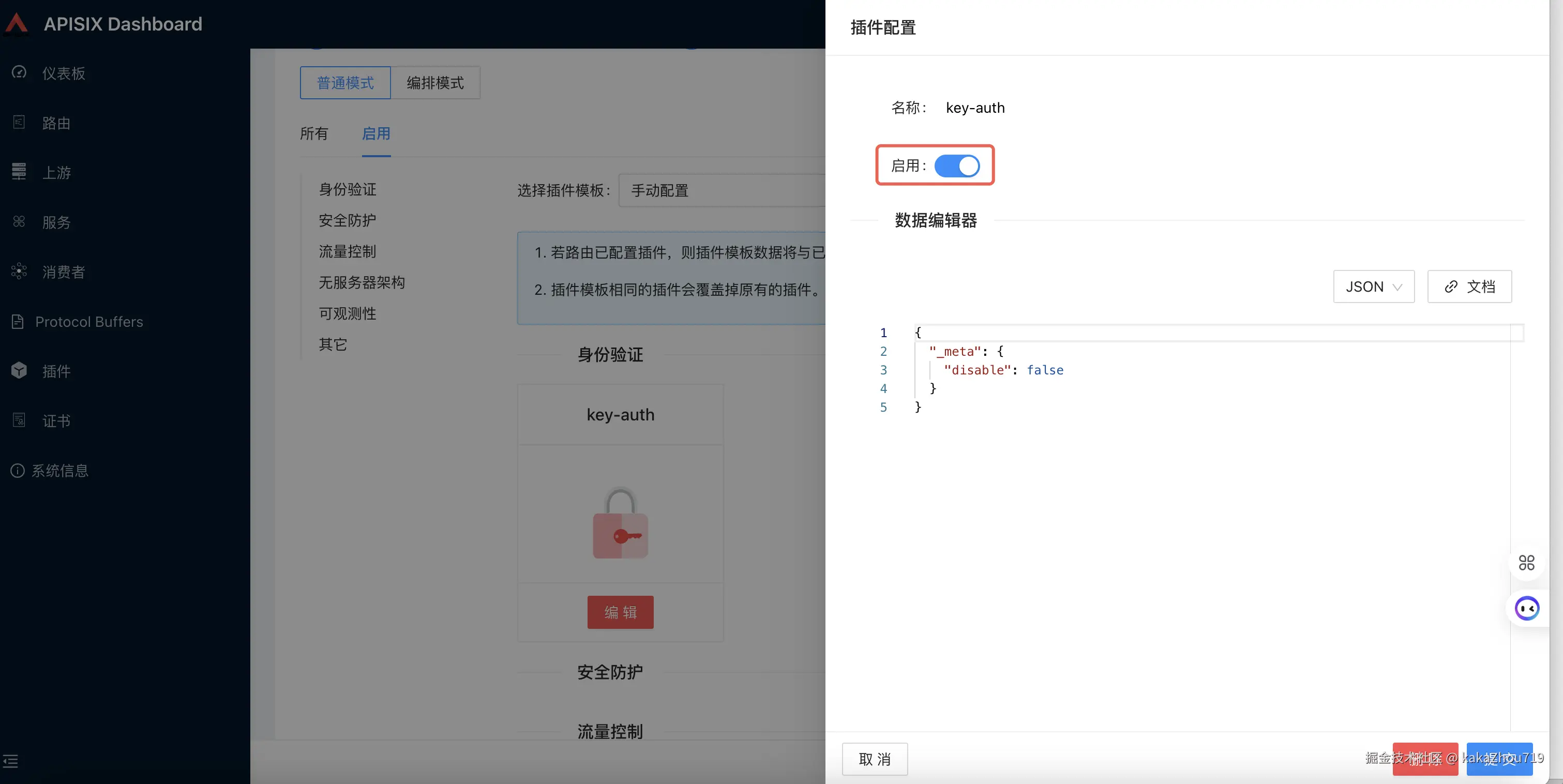 在配置路由的时候,选择需要的插件,例如开启key-auth插件,相关的key-auth配置已经在上一步consumer中配置好了,无需再填写。