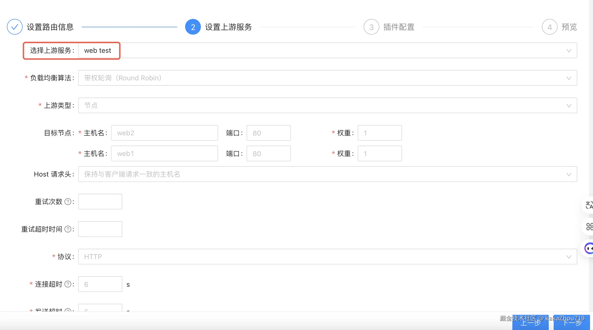 选择上一步配置好的上游服务web-test,也可以自定义写对应的upstream信息。