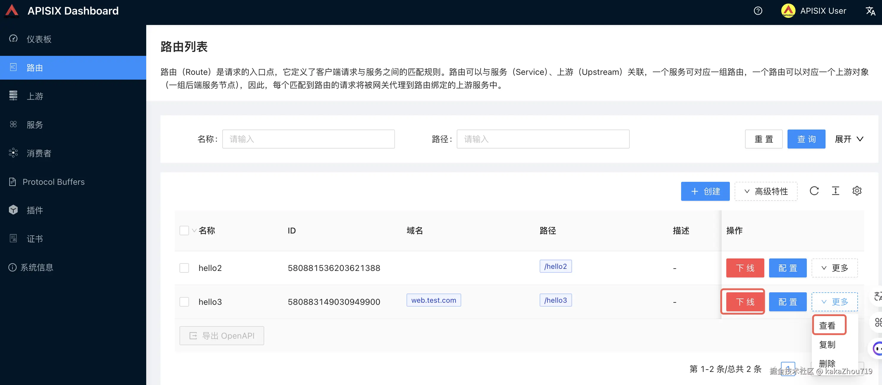 也可以选择上线下线操作和yaml配置信息查看