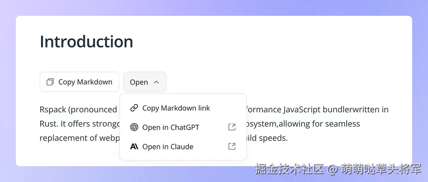 Rspress 2.0 beta 引入 Markdown 复制组件,通过 @rspress/plugin-llms 插件生成 llms.txt 标准文件,便于大模型分析文档。