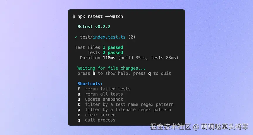 Rstest 0.2 引入 Mock API(支持 ESM 模拟)、增量重运行的 watch 模式,以及 CLI 快捷键,提升测试效率。