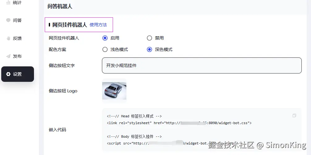 同样在配置里面启用网页挂件机器人。将生成的css和js要引入到页面即可。