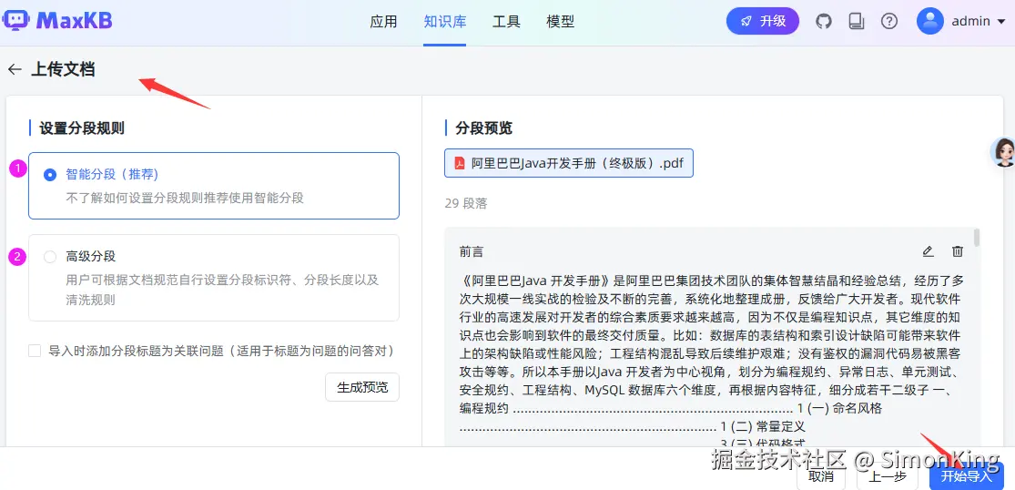 图中需要设置分段规则,这个是Dify有一定的相似之处。高级分段确实就是自定义分段标识,我们这里使用智能分段。