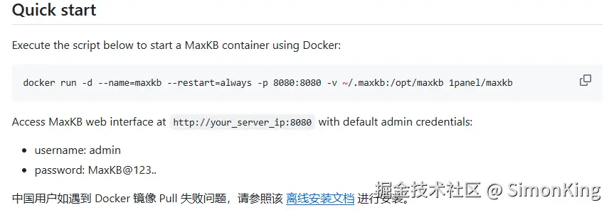 docker run -d --name=maxkb --restart=always -p 8080:8080 -v ~/.maxkb:/opt/maxkb 1panel/maxkb