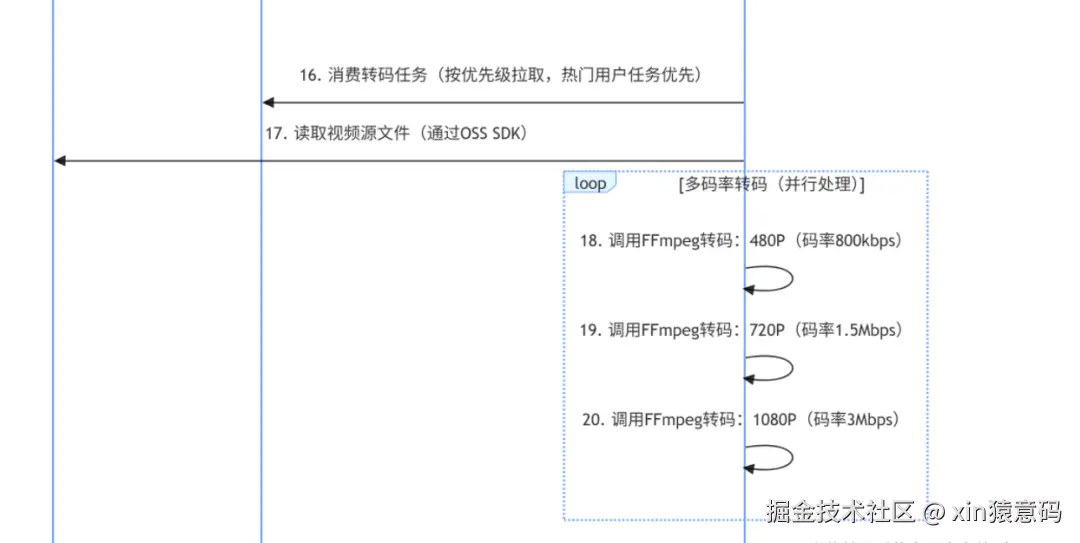 4. 转码服务消费任务,处理多码率转码(对应时序图 16-20 步)