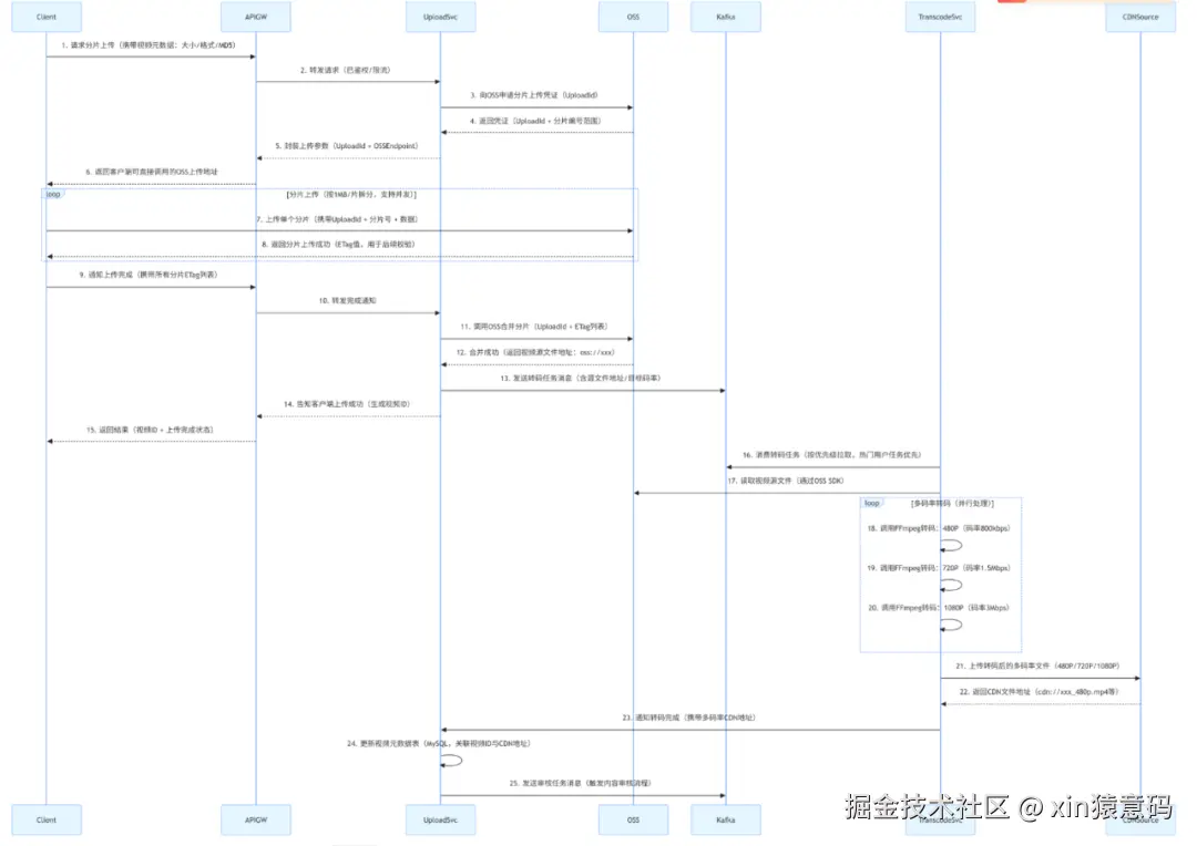 以下时序图覆盖了从 “客户端发起上传” 到 “转码完成入库” 的全链路,涉及客户端、API 网关、上传服务等 7 类核心组件,每一步都标注了关键技术选型和数据流向,让你一目了然。