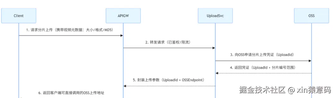 1. 客户端发起上传请求,获取分片上传凭证(对应时序图 1-6 步)