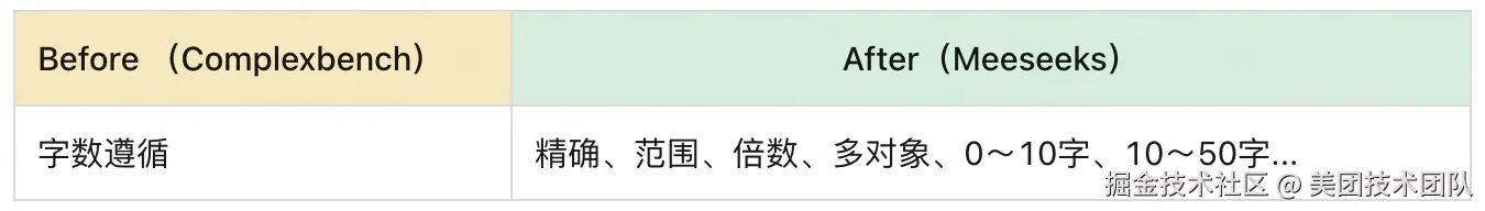 其次是 评测粒度更细,它将单一约束拆解得更为精细,如将“字数遵循”细分为精确值、范围、倍数等多种情况,实现了对模型能力的精准画像。