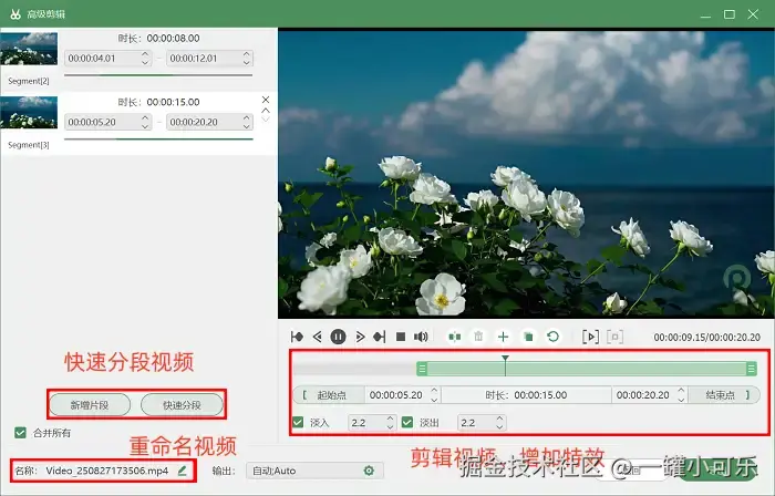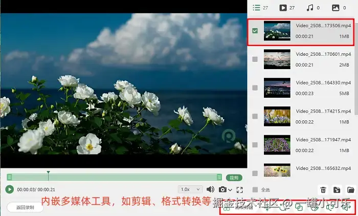 步骤3:确定录制完成后,可以直接点击 “高级剪辑” 进入后期编辑的页面,对视频进行片段分割、合并,还能增加淡入淡出特效等操作。