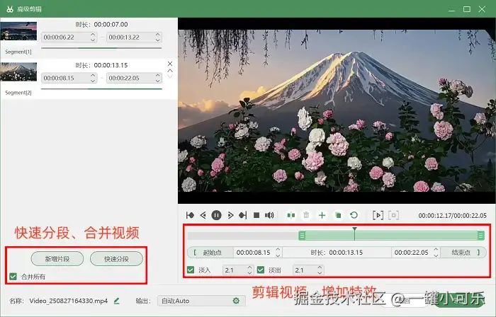 步骤3:如果你要对视频进行后期处理,可以点击目标视频旁的 “高级剪辑” 功能,进入剪辑界面后可以对视频进行重命名,便于后续查找和分类。还可以为视频片段之间添加转场特效,提升视频流畅度与观赏性。
