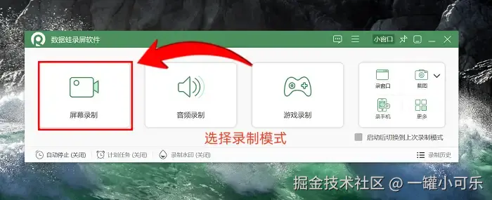 步骤1:首先启动数据 蛙录屏软件,进入软件主界面的“录制模式选择”页面。该软件提供多种录制模式。本次重点介绍 “屏幕录制” 模式——此模式适用于课件制作、软件操作演示、网页内容截取等常见场景,点击 “屏幕录制” 选项即可进入下一步操作界面。