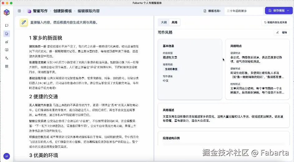 文档识别和完成后,用户可继续编辑大纲和文章内容,也可在模板设置中查看和调整写作风格。
