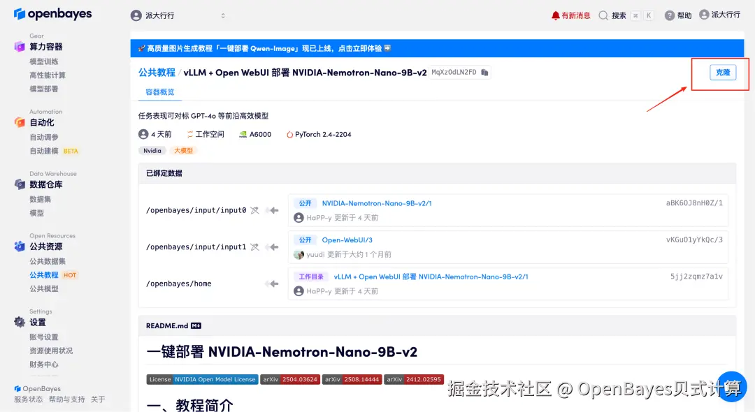 1.登录 OpenBayes.com,在「公共教程」页面,选择「vLLM + Open WebUI 部署 NVIDIA-Nemotron-Nano-9B-v2」教程。