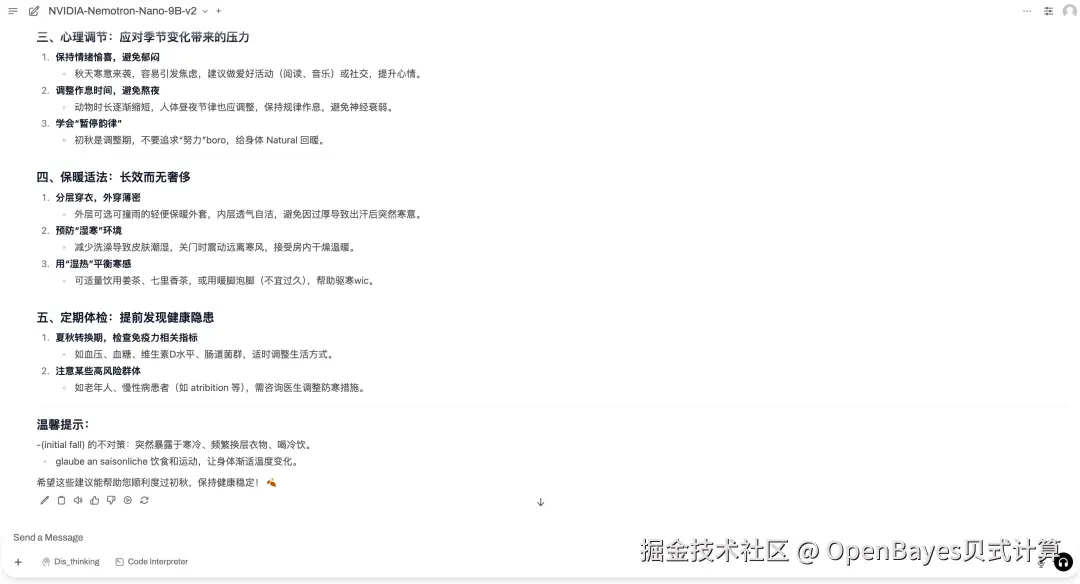立秋之后天气逐渐转凉,就让 Nemotron-Nano-9B-v2 为我们提供一些初秋防寒养生小指南吧。
