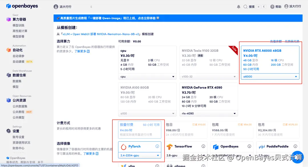 3.选择「NVIDIA RTX A6000 48GB」以及「PyTorch」镜像,按照需求选择「按量付费」或「包日/周/月」,点击「继续执行」。新用户使用下方邀请链接注册,可获得 4 小时 RTX 4090 + 5 小时 CPU 的免费时长!