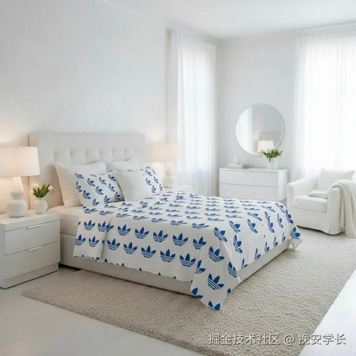 并且改变现有的物品也可以,这是一张纯白的床,这是一个三叶草logo。合体!自动生成了三叶草床单