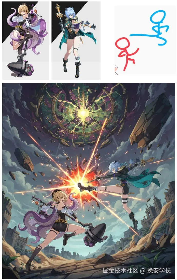 此外,上传人物的照片,再上传一个姿势草图,它就能画出指定动作的图。不需要lora,没有复杂的工作流,效果特别好。