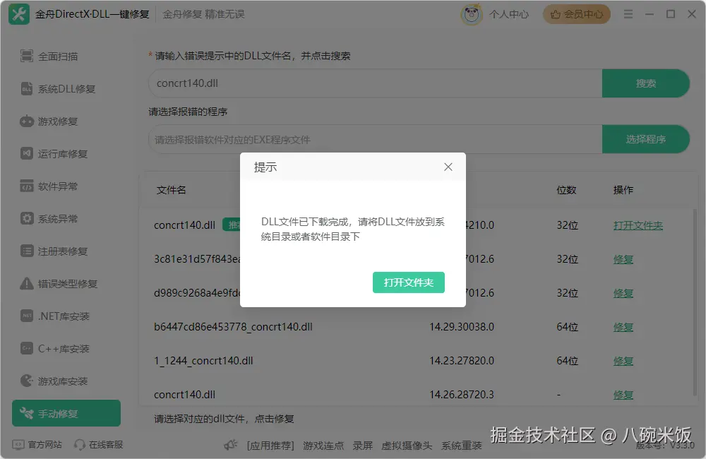 关于“concrt140.dll丢失”的解决方法就分享到这里了,通过dll修复工具、手动下载dll、重新安装程序能够快速解决问题,适合新手使用。