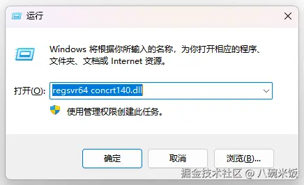Step3、按下 Win+R 输入regsvr64concrt140.dll注册文件