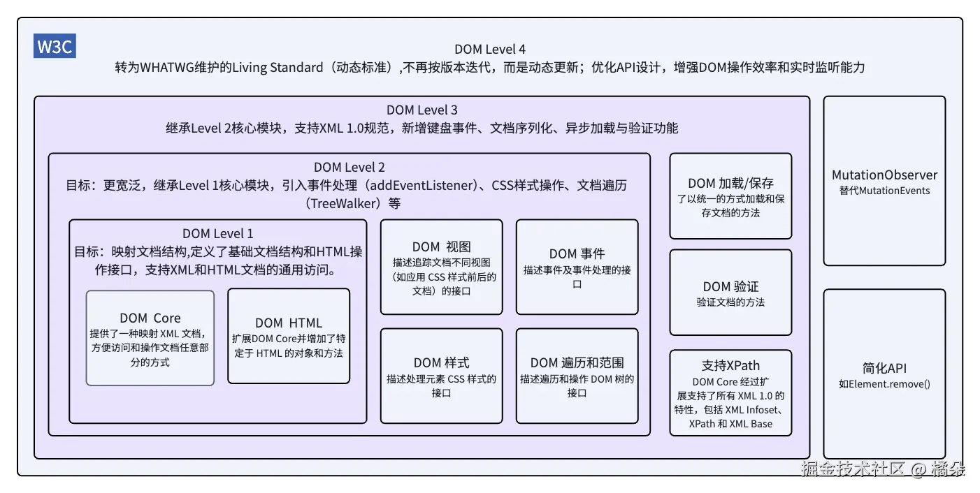 DOM Core是核心模块,是基础款工具,主要对应XML文档,能访问和操作文档的任意部分,但用在网页开发里有点繁琐;