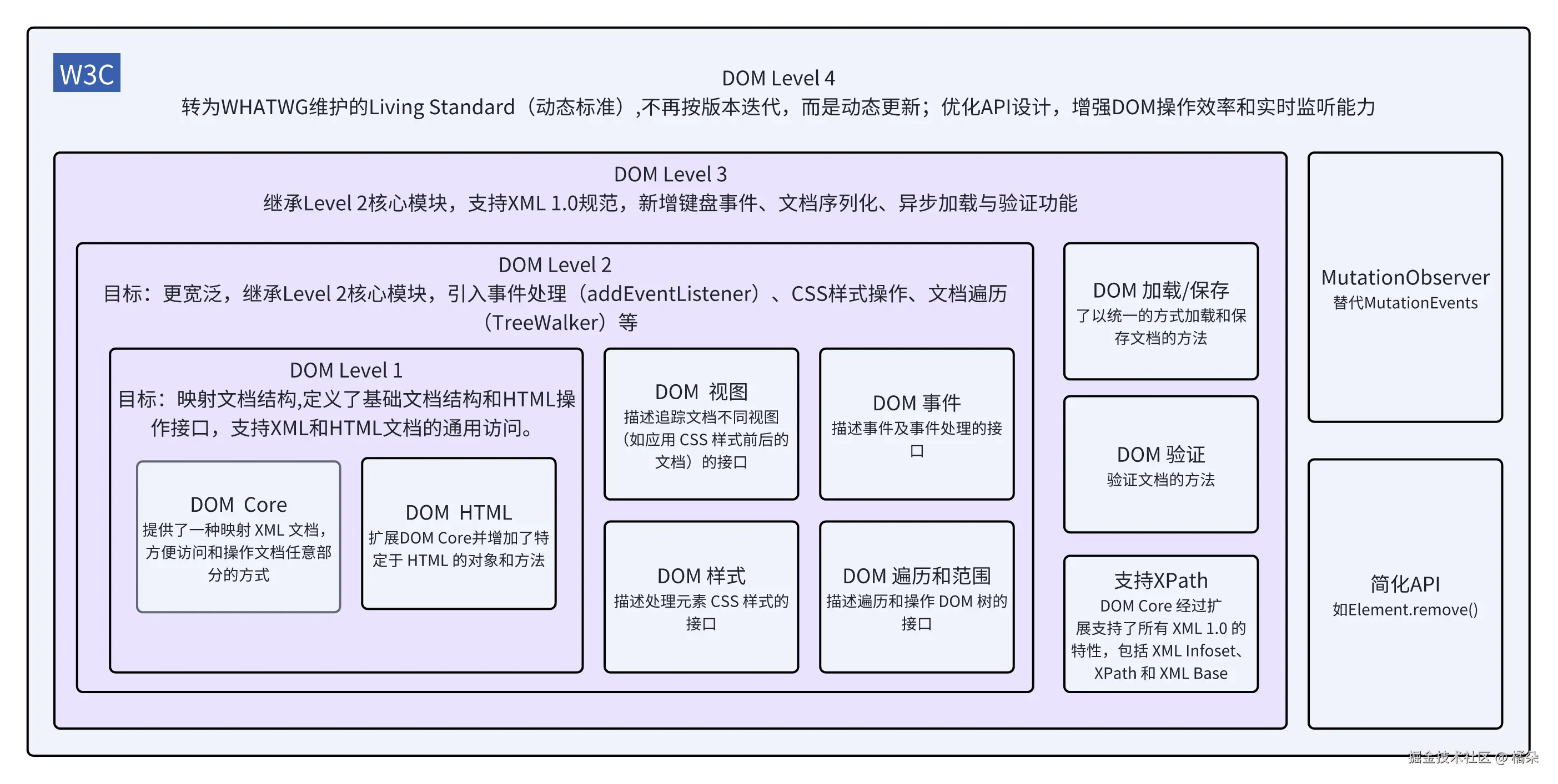 1998年10月,DOM Level 1成为W3C的推荐标准。这个规范由两个模块组成:DOM Core和DOM HTML。