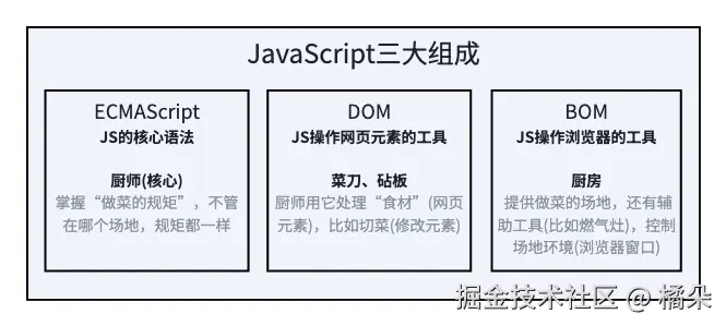 JavaScript主要由三部分组成:ECMAScript(JS的核心语法)、DOM(JS操作网页元素的工具)、BOM(JS操作浏览器的工具),三者分工明确、协同工作。
