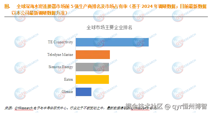 全球范围内,深海水密连接器主要生产商包括主要厂商有TE Connectivity, Teledyne Marine, Siemens Energy, Glenair, Eaton, SLB, MacArtney等,2024年前五大厂商占据国际市场大约65%的收入份额。