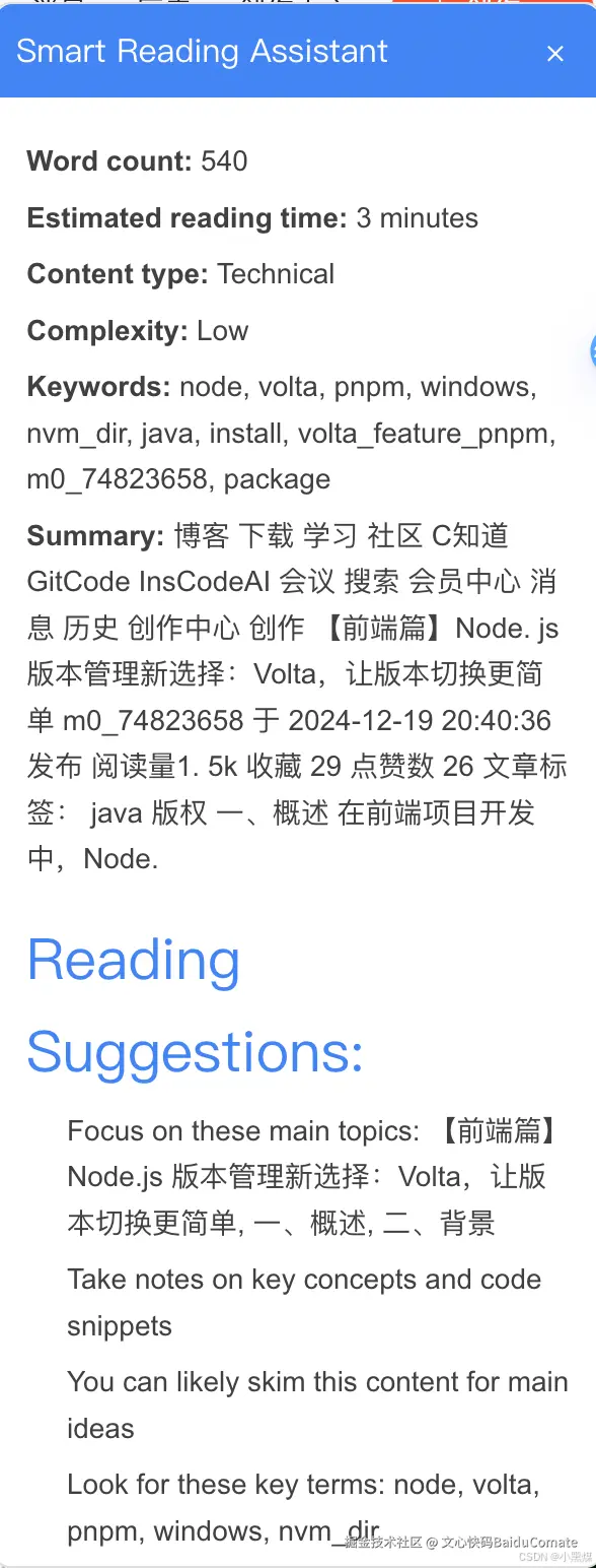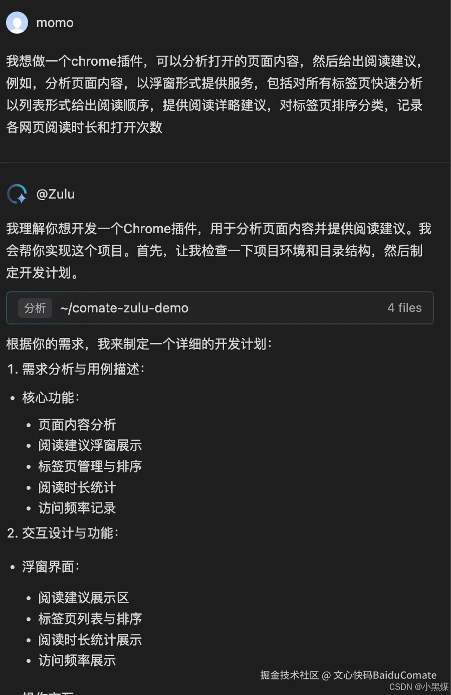 博主是一个前端仔,听说Comate Zulu智能体编程很好用,想试下能力,正好最近有个想法:由于每天习惯打开几十个标签页查资料看文档,但反复横跳有点烦,信息过载难以聚焦。就萌发了个想法,希望有个能替我预习各个标签内容,给出阅读建议,优先读价值高的文档,并且可以统计我打开各标签页的打开次数和停留时间。