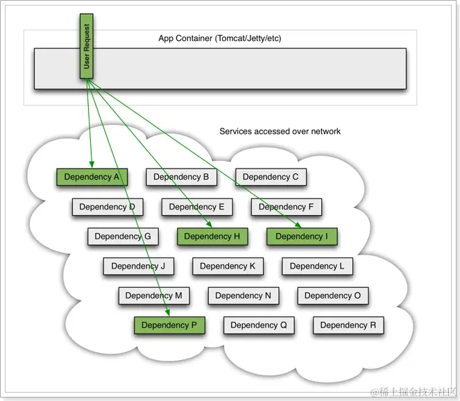 如图,如果服务提供者I发生了故障,当前的应用的部分业务因为依赖于服务I,因此也会被阻塞。此时,其它不依赖于服务I的业务似乎不受影响。
