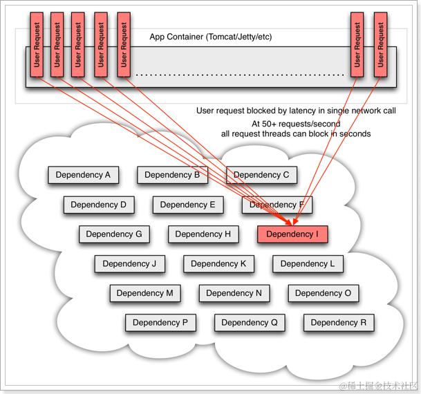 但是,依赖服务I的业务请求被阻塞,用户不会得到响应,则tomcat的这个线程不会释放,于是越来越多的用户请求到来,越来越多的线程会阻塞: