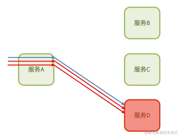 当发现访问服务D的请求异常比例过高时,认为服务D有导致雪崩的风险,会拦截访问服务D的一切请求,形成熔断: