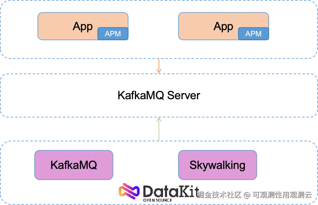 - 应用接入 SkyWalking 探针,并通过 KafkaMQ plugin 进行数据上报至 KafkaMQ Server