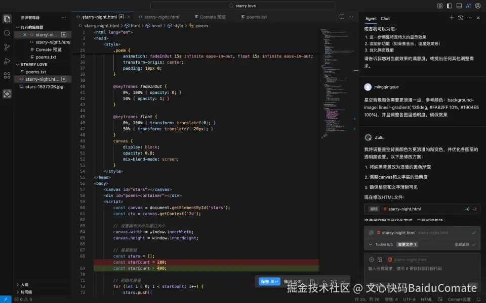 Zulu在10秒内就输出了完整代码框架。并且现在最新版的文心快码Zulu已经支持在执行过程中展示Todo list,我们可以在开发流程中更好地监控Zulu的执行。