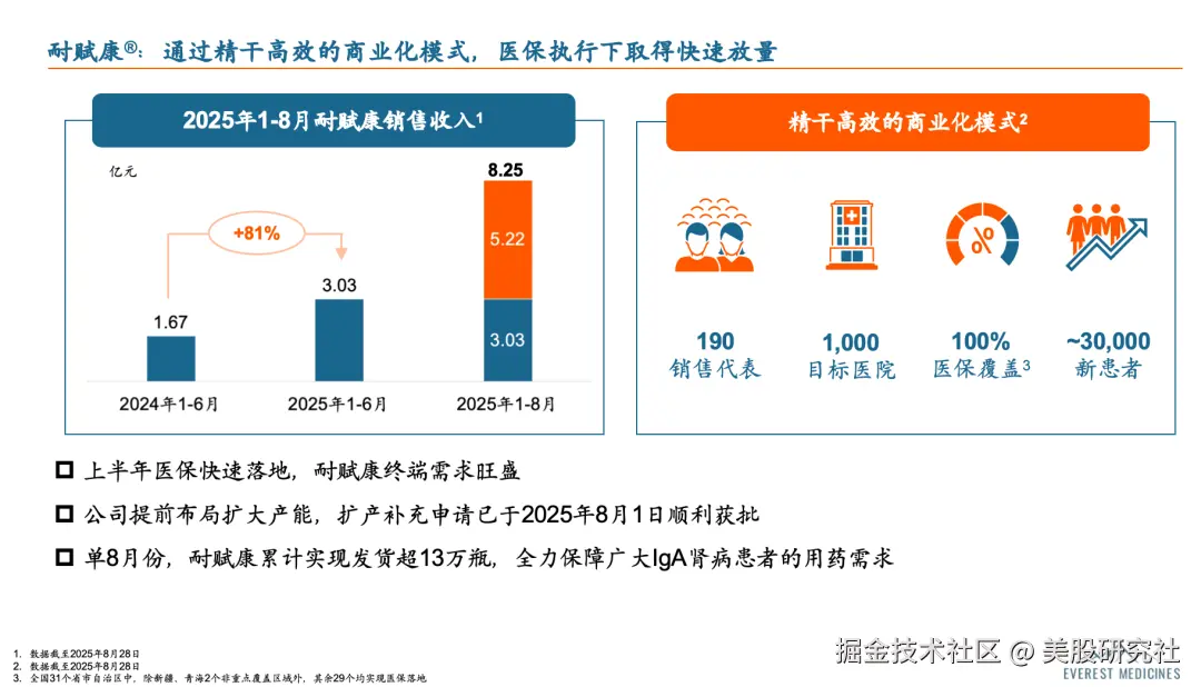 在销售端,公司已围绕耐赋康®搭建起完整销售体系。到今年8月,肾科销售团队扩充至190人,目标医院覆盖1000家较去年同期几近翻倍,并实现医保全覆盖,体现出公司高效的运营效率。销售团队的专业与渠道网络,成为公司自我“造血”的关键。