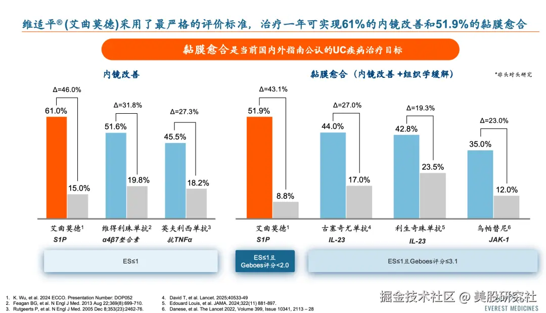 作为新型、高选择性S1P调节剂,艾曲莫德以其快速的起效时间和深入的黏膜愈合效果脱颖而出。相比维得利珠单抗等生物制剂,其口服给药方式更为便捷,并对经生物制剂治疗失败的患者依然有效。