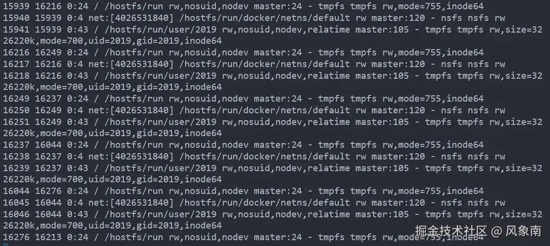 此处省略两个字,每执行一次 docker cp,/proc/{pid}/mountinfo 就新增几条 /hostfs/run 的挂载记录。