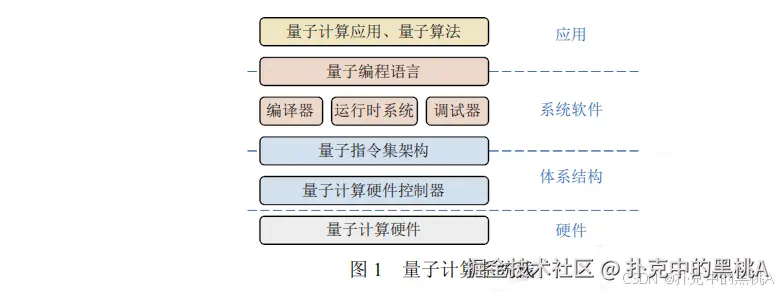 论文里的 “量子计算系统栈”(见图 1)清晰展示了从应用到硬件的完整链条,咱们逐层拆解: