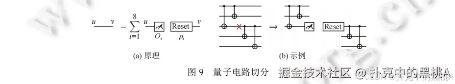 如果电路需要的量子比特数超过硬件规模,或大规模硬件噪声太高,可把电路拆成多个小电路(如图 9),在小机器上执行后综合结果。就像把大蛋糕切成小块,分着吃。