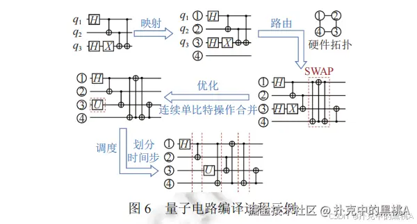 图 6 是一个编译实例,从逻辑电路到硬件执行,中间经过映射、路由、优化和调度,最终的电路能在硬件上正确执行,且错误率尽可能低。