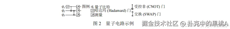 图 2是一个量子电路的例子,横线代表量子比特,方框代表量子门,最右边的竖线代表测量。电路深度指 “最长操作路径的长度”(比如这个例子里,从 H 门到测量共 4 步),深度越小,计算越快,越不容易受退相干影响。