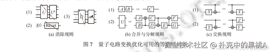 连续两个共轭转置的门(如 U 和 U†)可消除(U×U†=I),比如 H×H=I(两个 H 门等于没操作)。