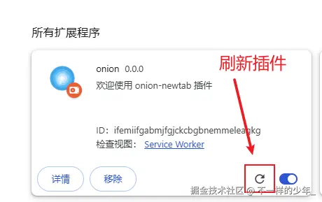 - 在Chrome扩展管理页面点击插件的刷新按钮