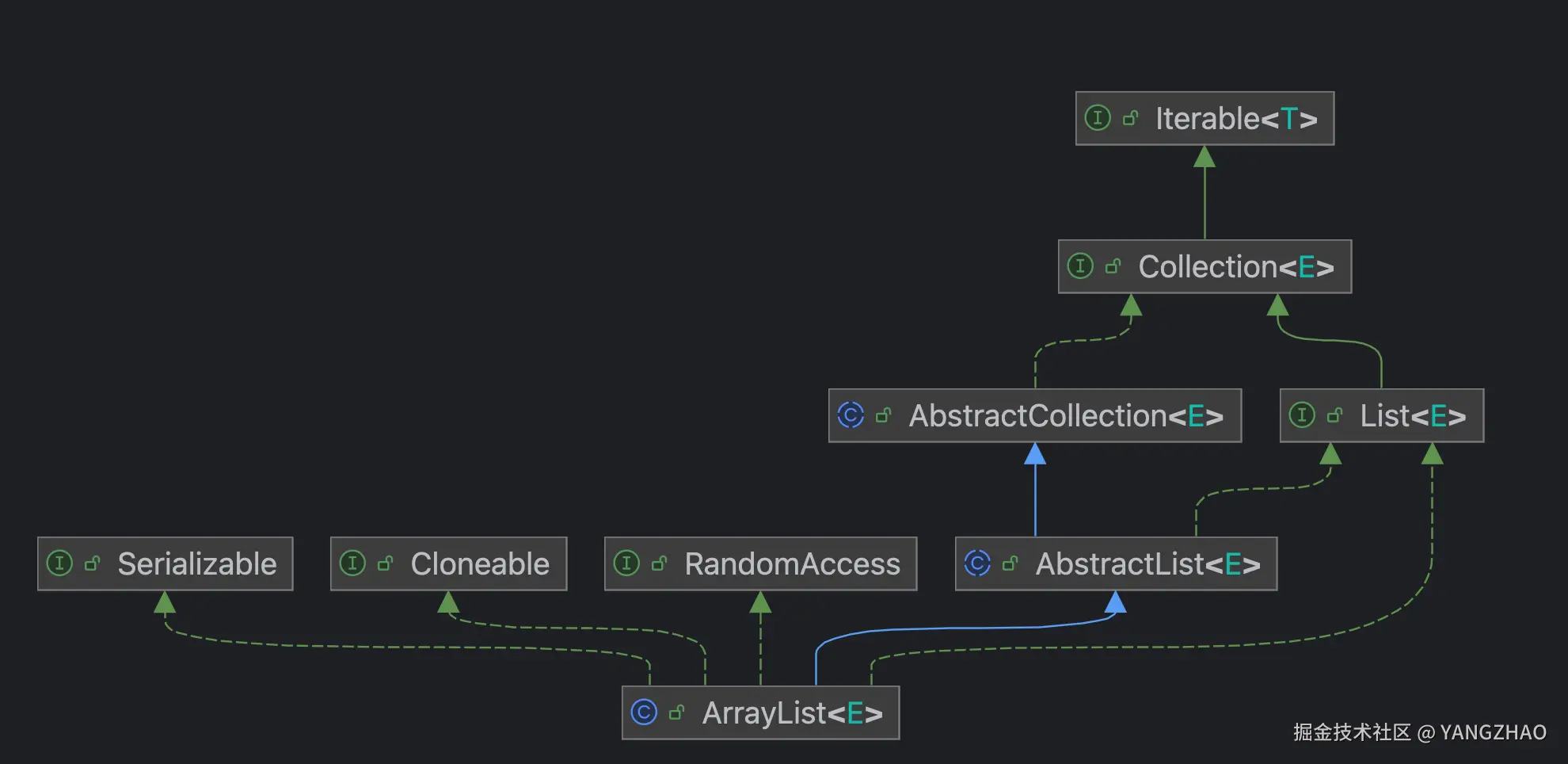 Iterable它是所有可迭代对象的顶层接口,让对象可以通过for-each循环或Iterator遍历元素。Collection<E>是Java集合框架的顶层接口。它定义了一组操作元素的通用方法,适用于任何集合类型(List、Set、Queue等)。List<E>定义了一个有序、可索引的集合行为,ArrayList通过实现它,成为一个标准的列表(List)类型。AbstractCollection<E>是一个抽象类,提供了集合框架的基础功能。AbstractList<E>是一个抽象类,是AbstractCollection<E>的子类,提供了列表的通用功能。Cloneable表示 ArrayList 支持克隆(复制对象)。RandomAccess这是一个标记接口(没方法),表示ArrayList支持高效的随机访问。Serializable是java.io包里的一个接口,没有定义任何方法。它的作用是告诉Java虚拟机(JVM):这个类的对象可以被序列化(转成字节流)和反序列化(从字节流恢复成对象)。