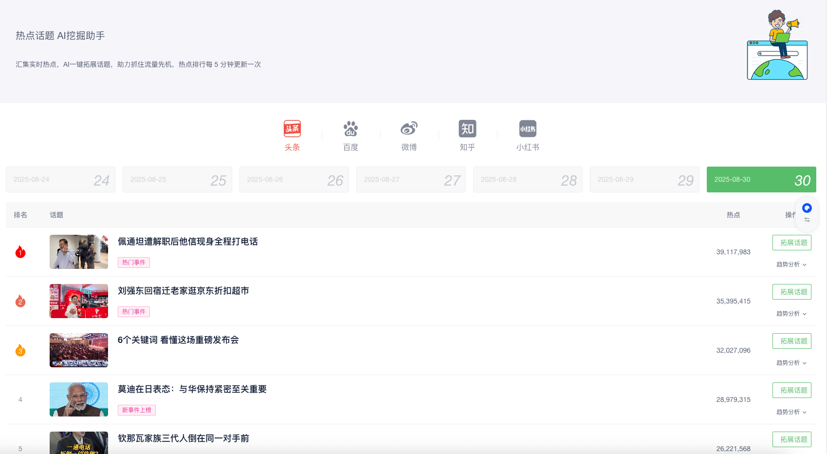 给个主题/关键词,生成结构清晰的成文草稿。需要丰富内容,就使用内容润色和段落扩写;热点话题不用到处找,一个页面汇聚全网实时热门话题,随时随地就能跟,只需一键快速生成热点文章,这追热门的速度谁能赶得上?AI配图还会按语义自动匹配,少走弯路。