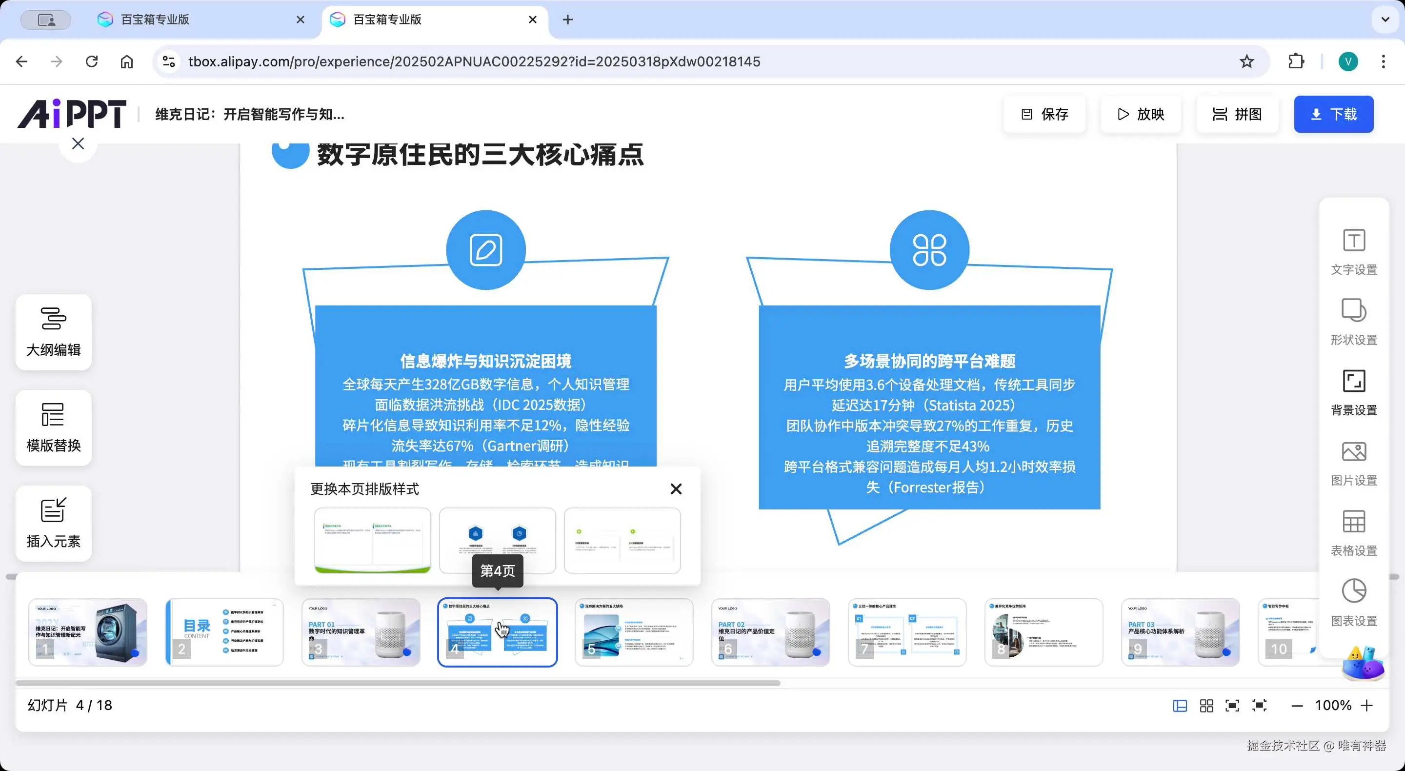 特别实用的是"样式替换"功能,点击后系统会提供多个新模板选择,且能保持整体风格一致性。