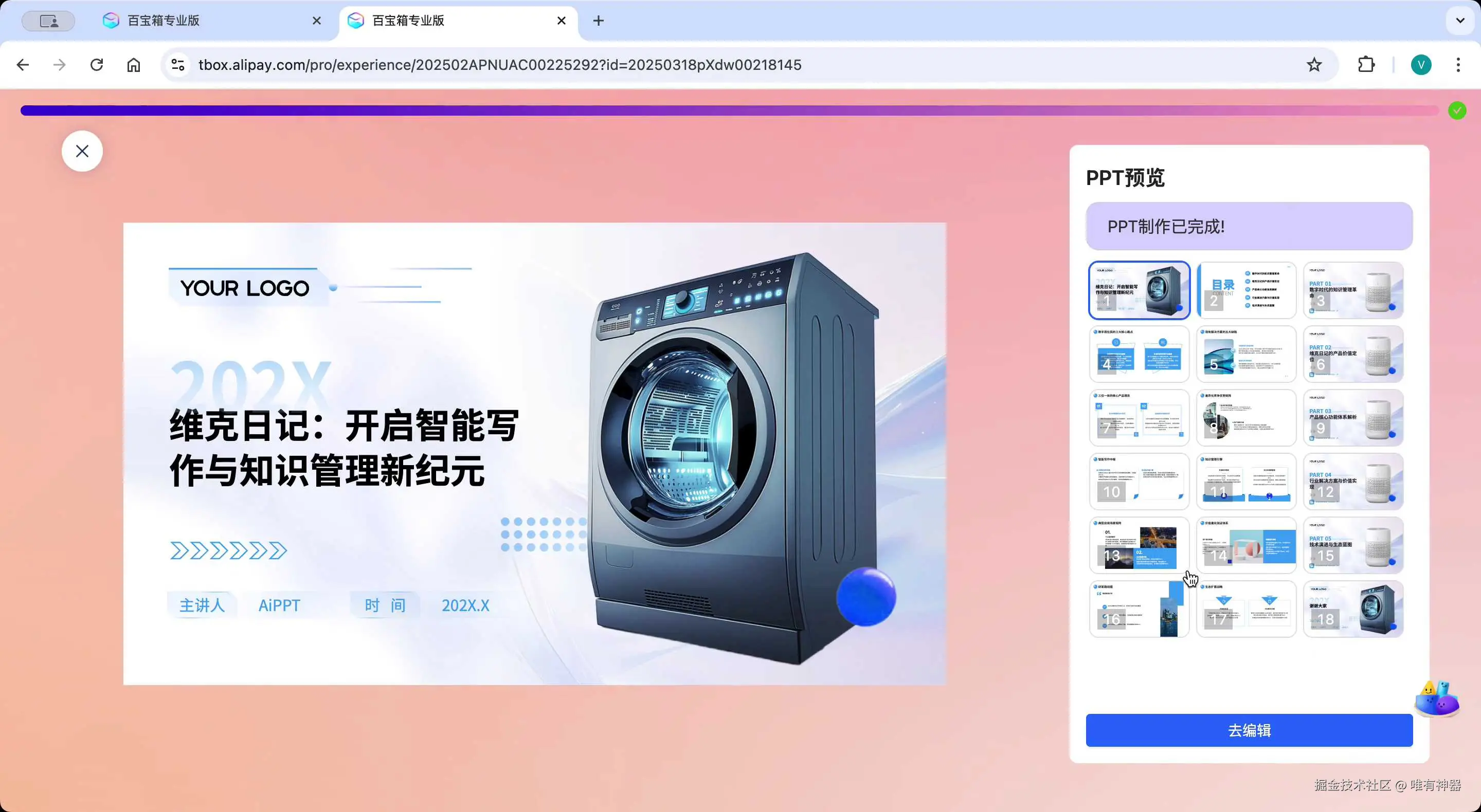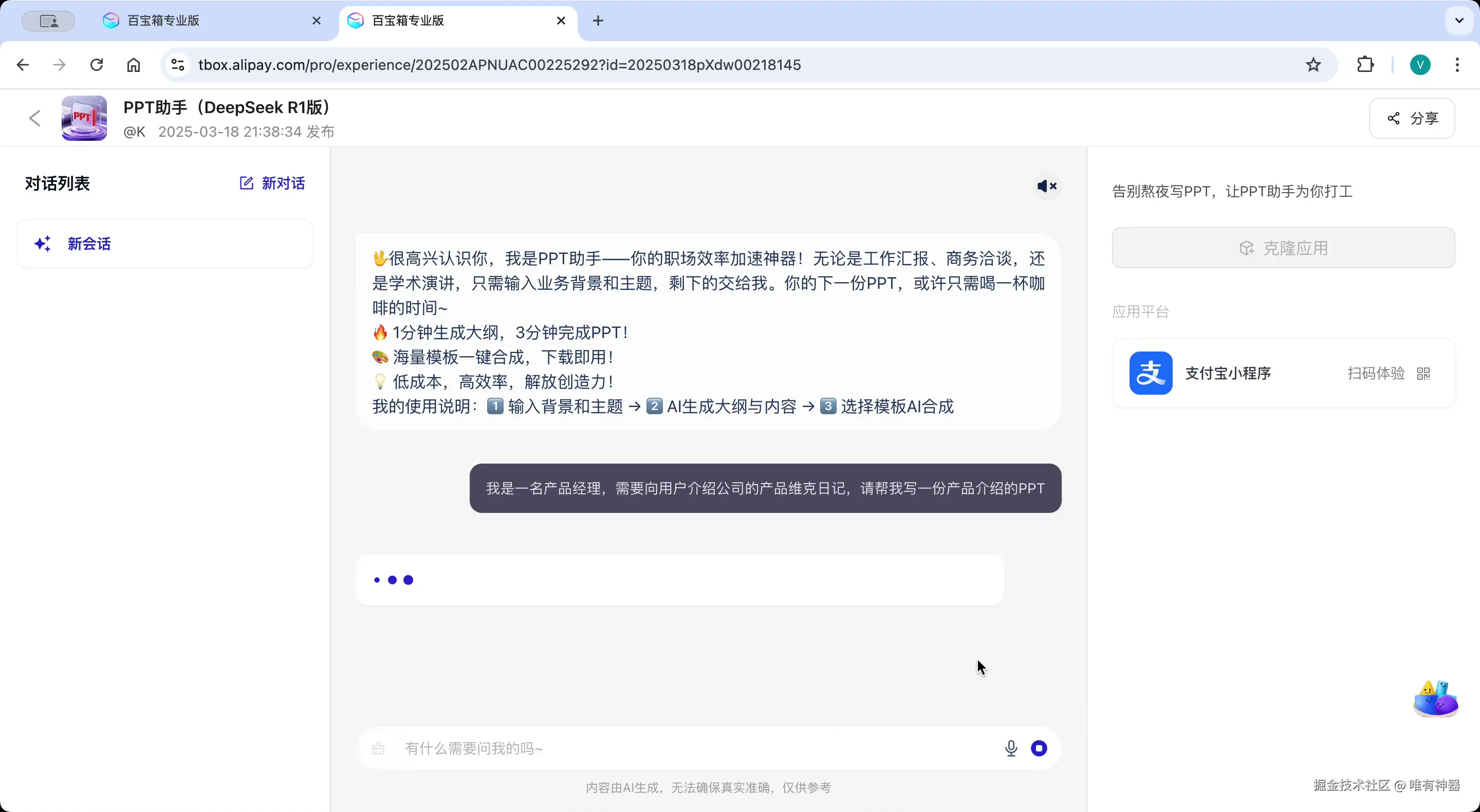 支付宝旗下的百宝箱PPT助手基于AI技术,用户只需输入主题和背景信息,系统就会自动生成PPT大纲和内容,并通过海量模板库合成完整的演示文档。
