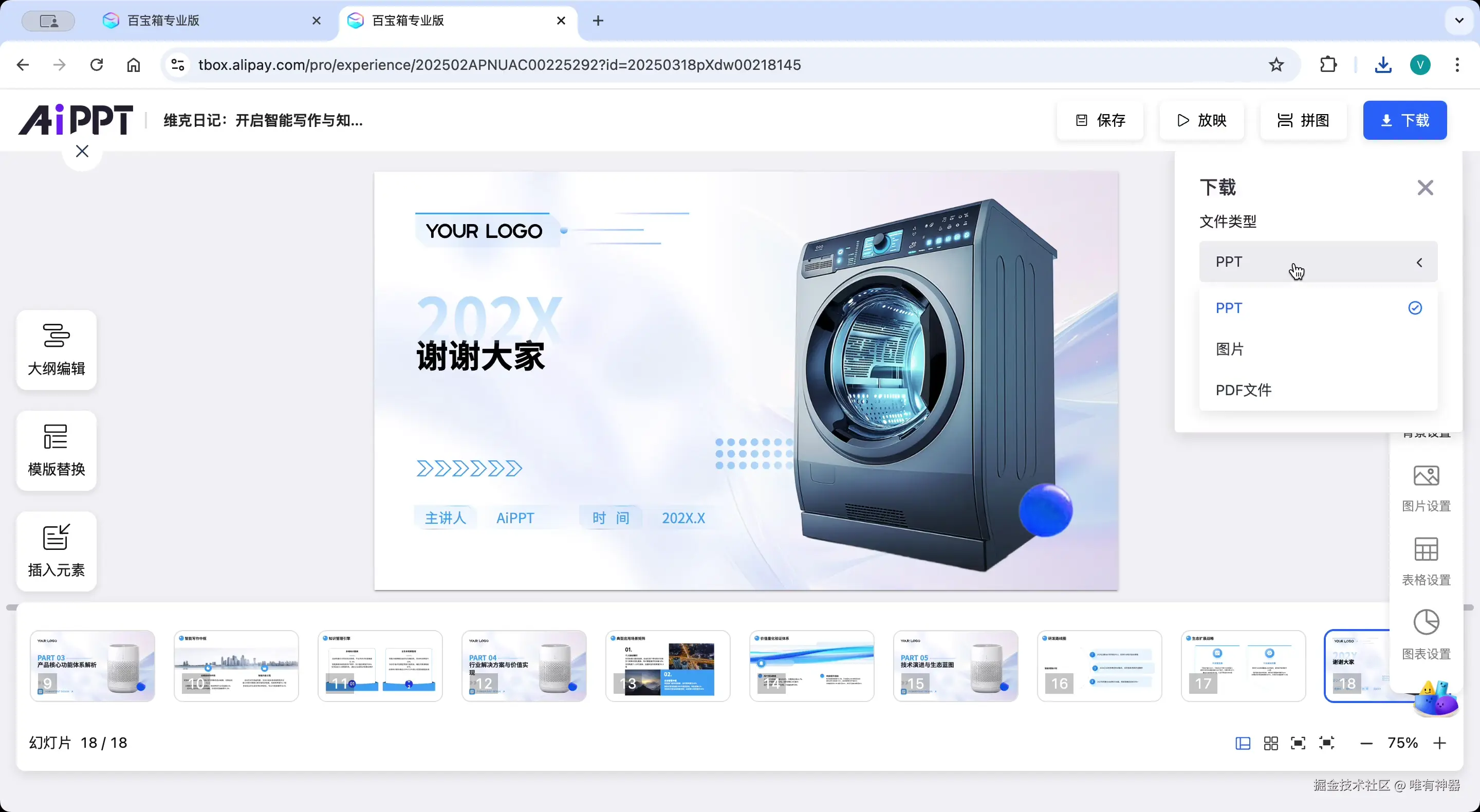 编辑完成后可以预览放映效果,满意后支持导出为PPT、PDF或图片格式。导出速度较快,一个10多兆的文件十几秒就能完成。